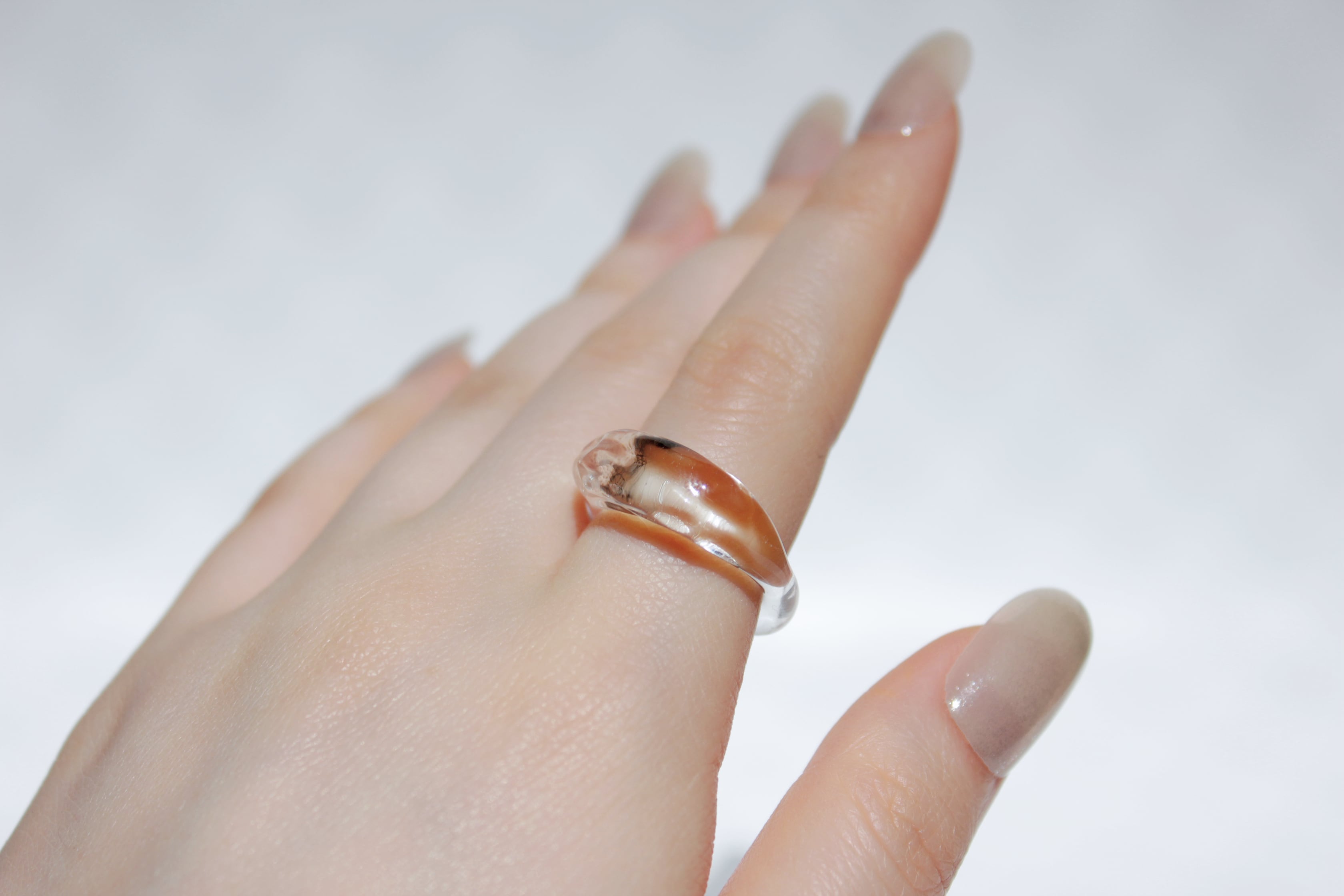 バーナーでガラスを溶かし、フリーハンドで成形しております。そのため、リングの形状は真円ではなく、わずかに揺らぎのある自然なフォルムとなっています。真円ではございませんため、実際に着用するとややゆとりを感じることがあります。少し大きめの作りとなる店、ご理解いただけますようお願いいたします。