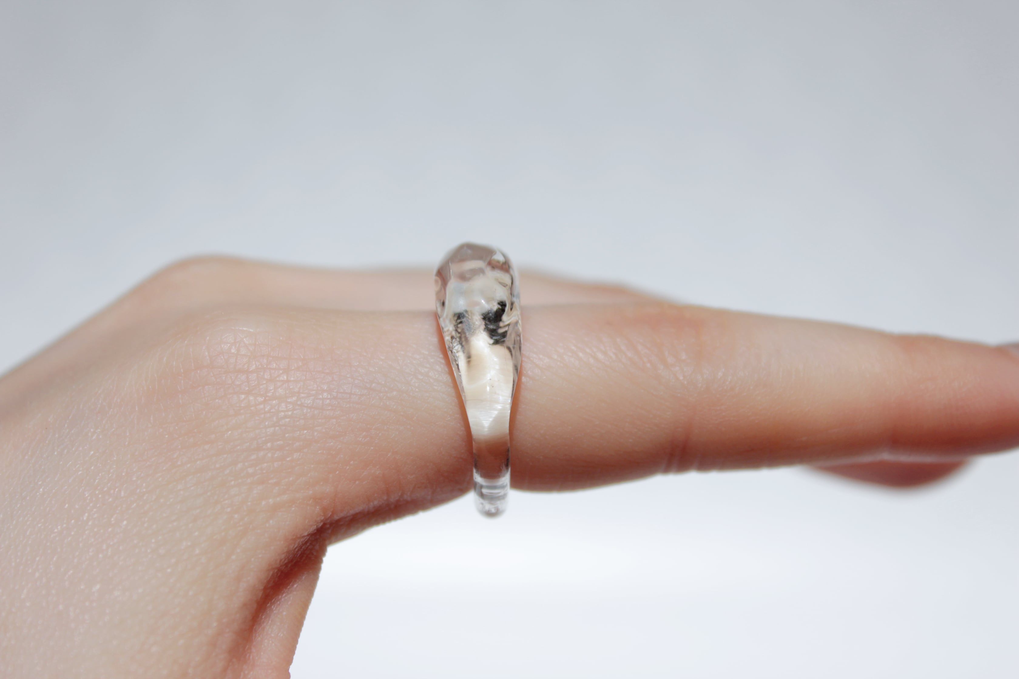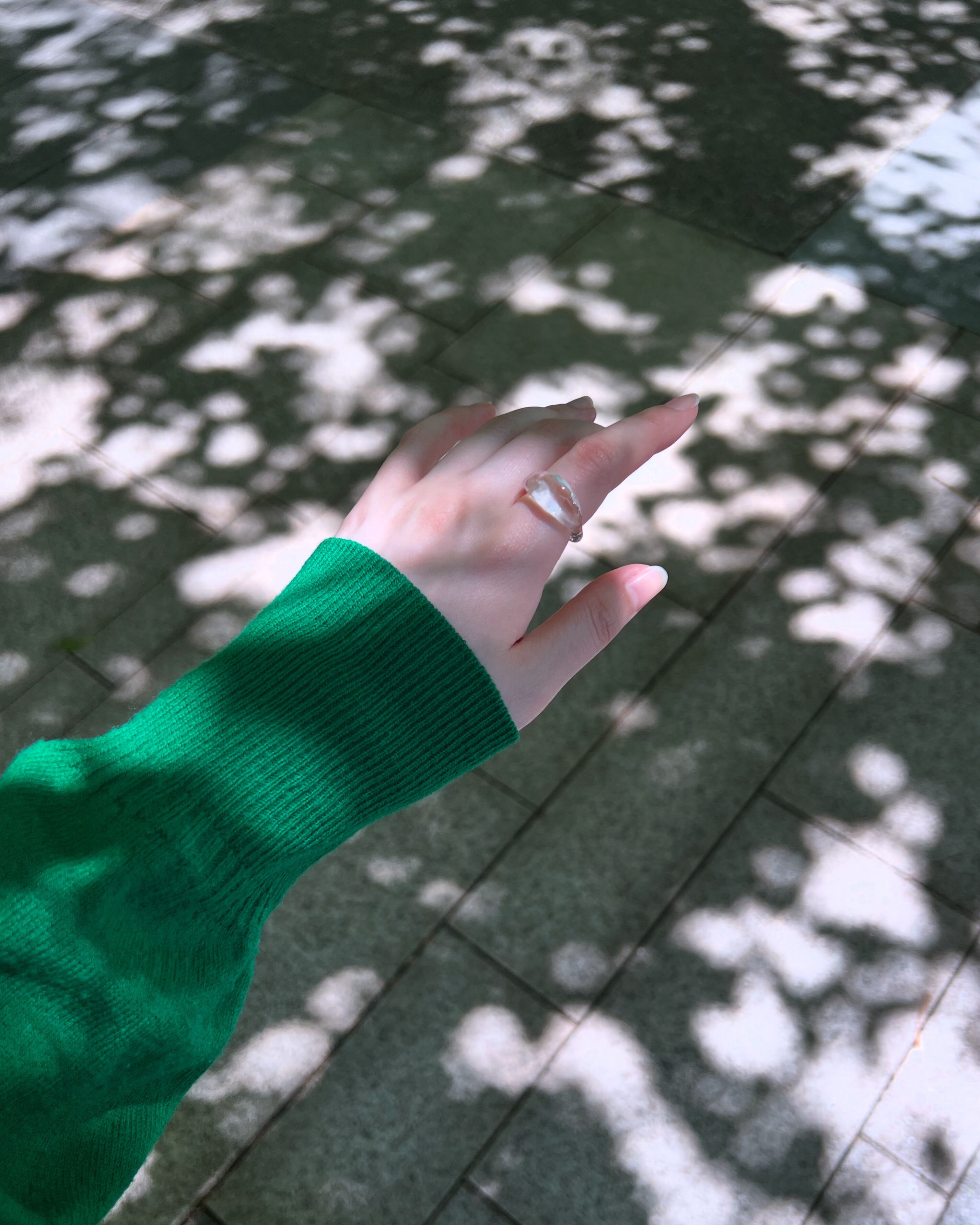 本作品《komorebi》は、優しく揺れる木漏れ日のゆらめきと煌めきをテーマに、透明なガラスの中にその美しさを閉じ込めたリングです。